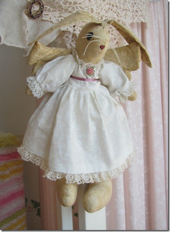 This bunny angel is hanging on a pink fabric screen in Carol’s bedroom.