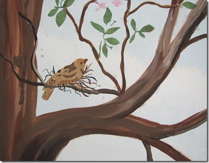 Carol painted the tree and branches freehand and then we made stencils for the leaves and the birds. It was very fun figuring out where to place the birds.