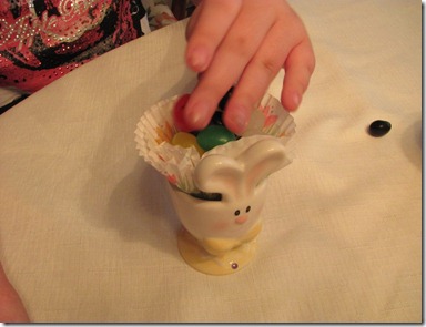 We pushed the papers into the egg cup… and added jelly beans..