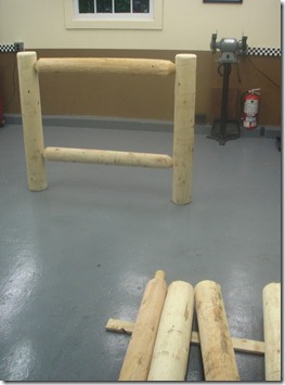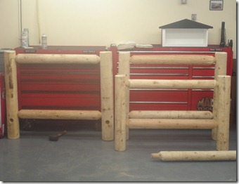 Here are the posts for the beds. He ground down the ends of the round beams so that they would fit snugly into the head and footboards. He said he had to grind down 24 of these!!