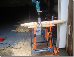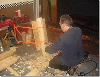 Here he is grinding holes for the posts to fit into.
