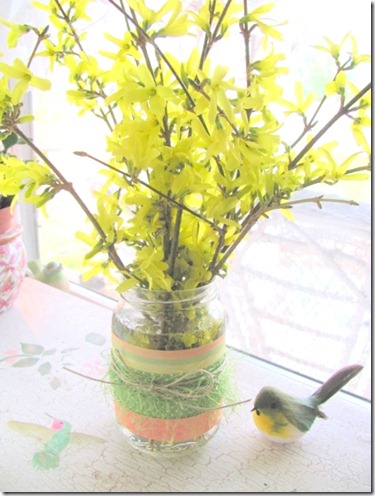 I wrapped the thready green yarn around and around and used a hemp string to make a bow. Wala! Quick, easy, and satisfying. AND a place to put some pretty forsythia blooms.