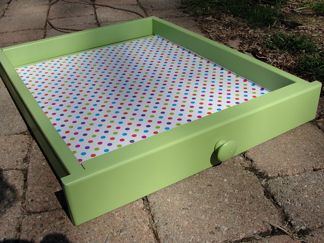 I sprayed the old drawer an Apple green color. Love it.