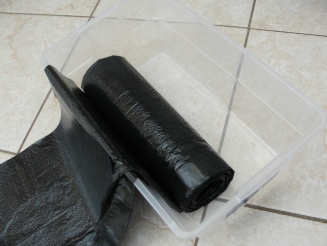 See? The roll fits right inside the shoebox. One thing I always hated was the cardboard box of black bags always getting crushed. That's not going to happen now, is it? HA!